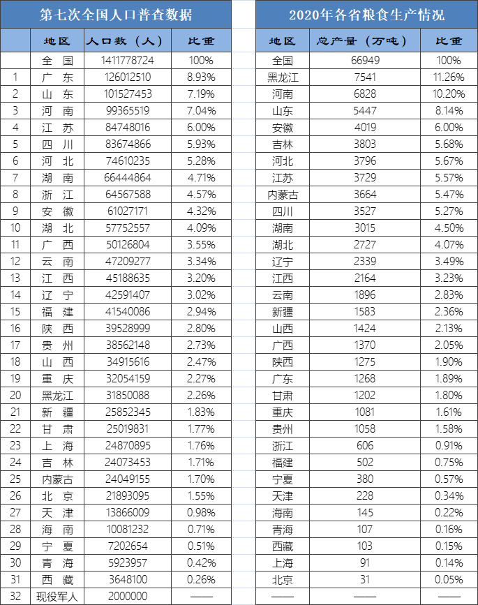 在我国,2020年黑龙江、河南、山东、安徽、吉林、河北、江苏、内蒙古、四川和湖南是全国粮食产量前十的省份。其中北方占据6席,河南、山东霸占前三甲,三省的粮食总产量占全国粮食生产的比重接近3成。黑龙江更是以7541万吨的粮食产量连续十年位列我国第一,是广东——全国第一人口大省的6倍。